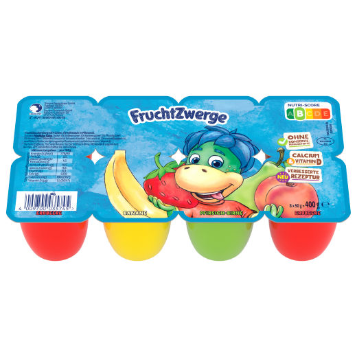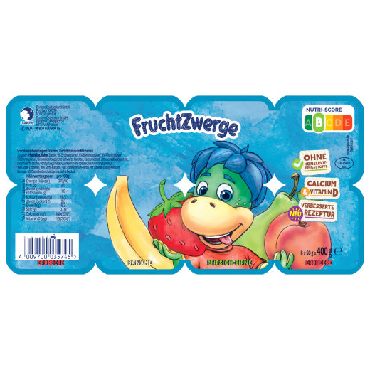 In diesen acht Bechern kommen die vier fröhlichen Fruchtsorten Banane, Pfirsich, Birne oder Erdbeere mit dem Guten der Milch und weiteren Zutaten zusammen:
